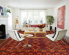 The rug showcases a vibrant combination of burnt orange, deep reds, and black, with intricate patterns accented by shades of gold and brown.