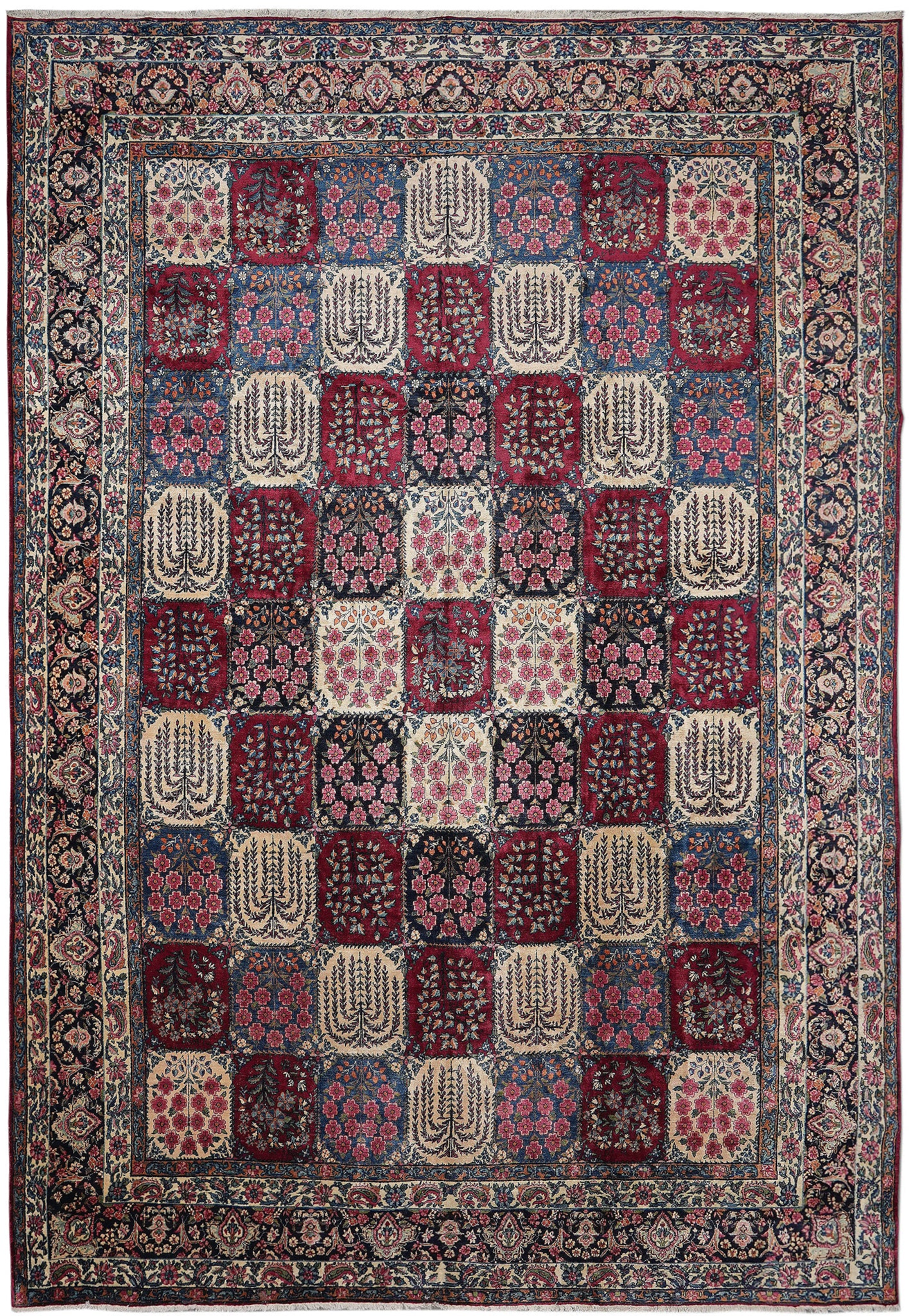 Multi color, featuring dominant shades of navy blue, burgundy red, cream, pink, and black.