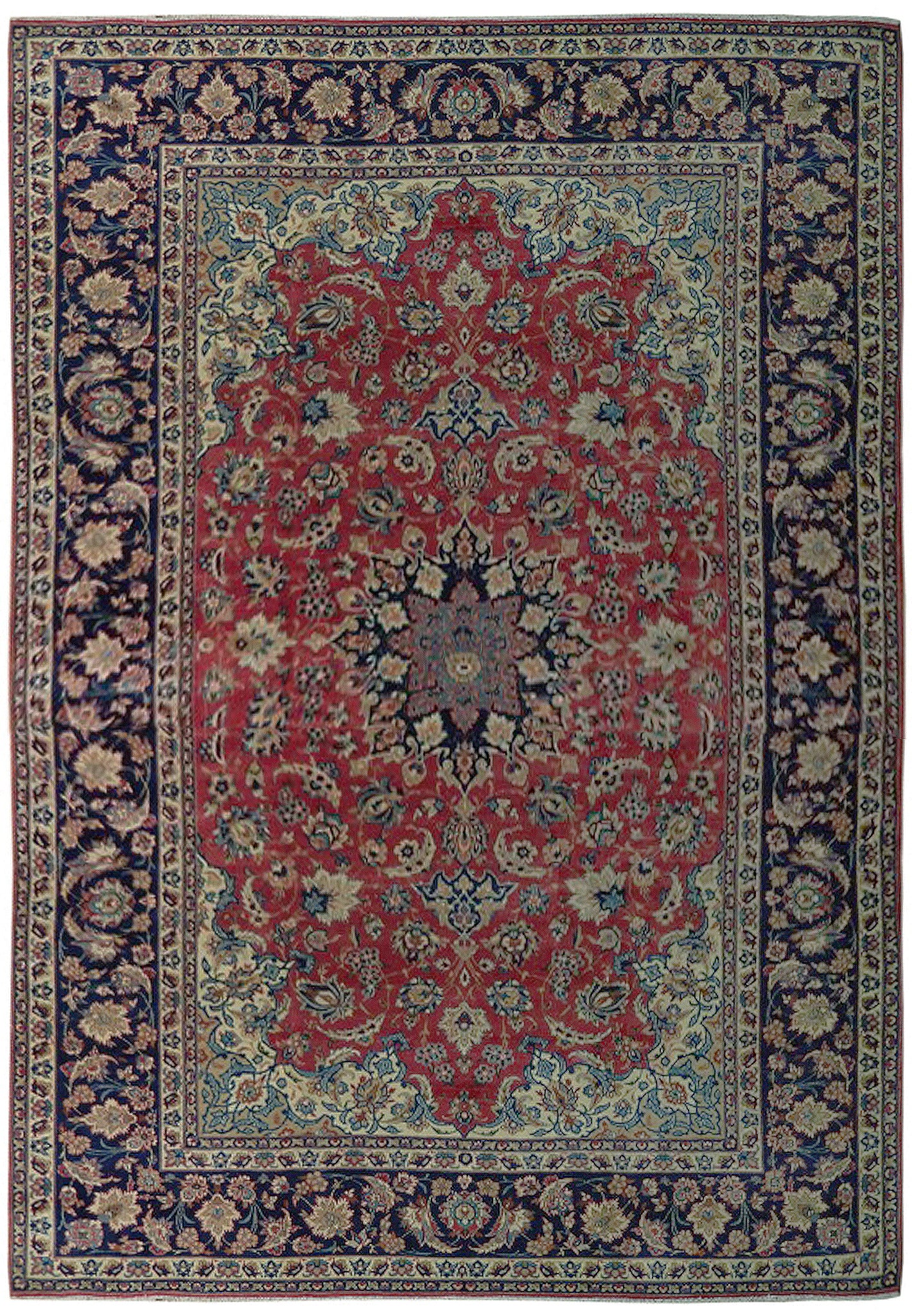 Red with navy blue, ivory, orange, green, light blue, and beige.