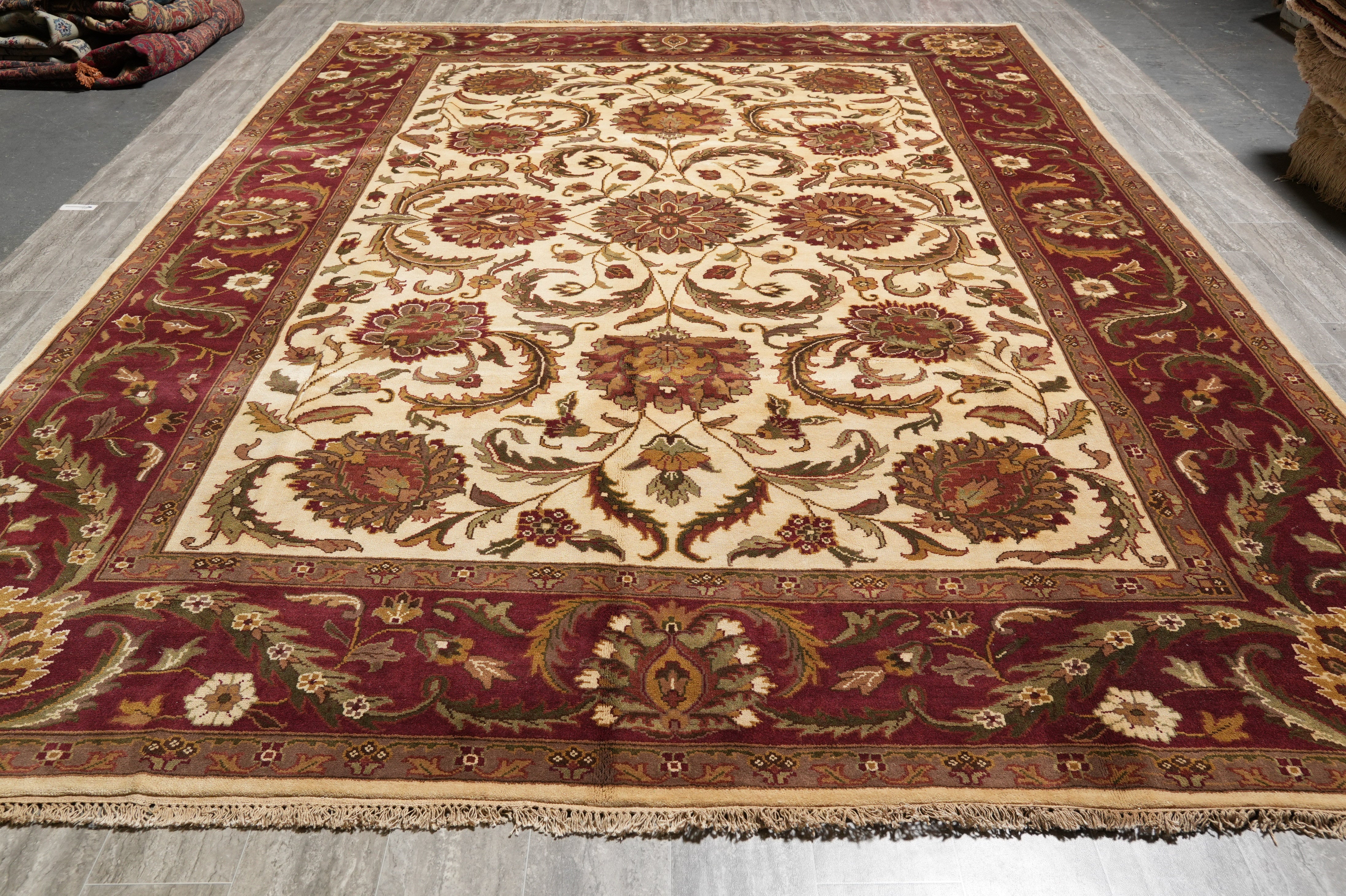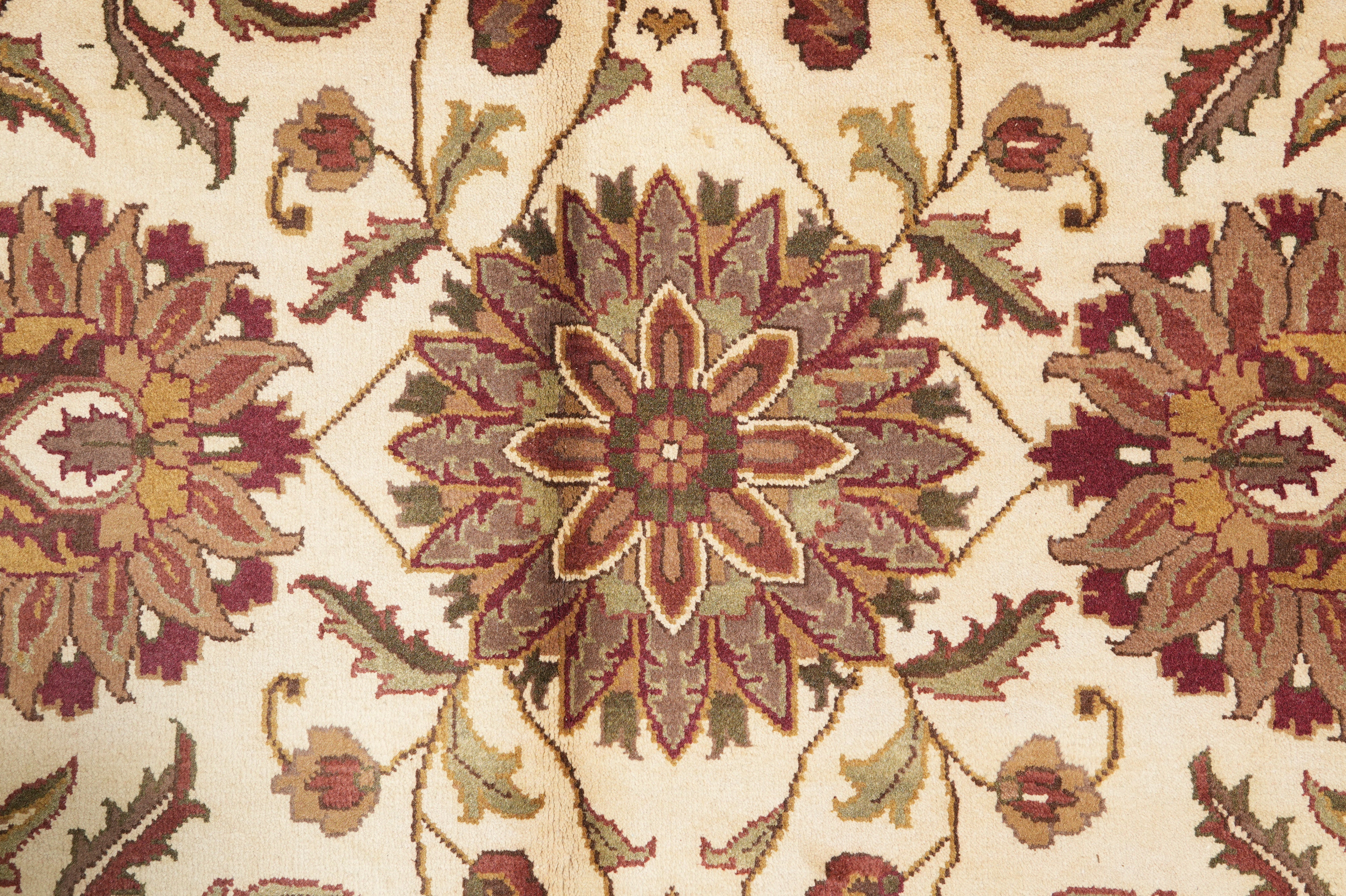Beige, with accents of maroon, green, brown, and hints of gold and ivory.