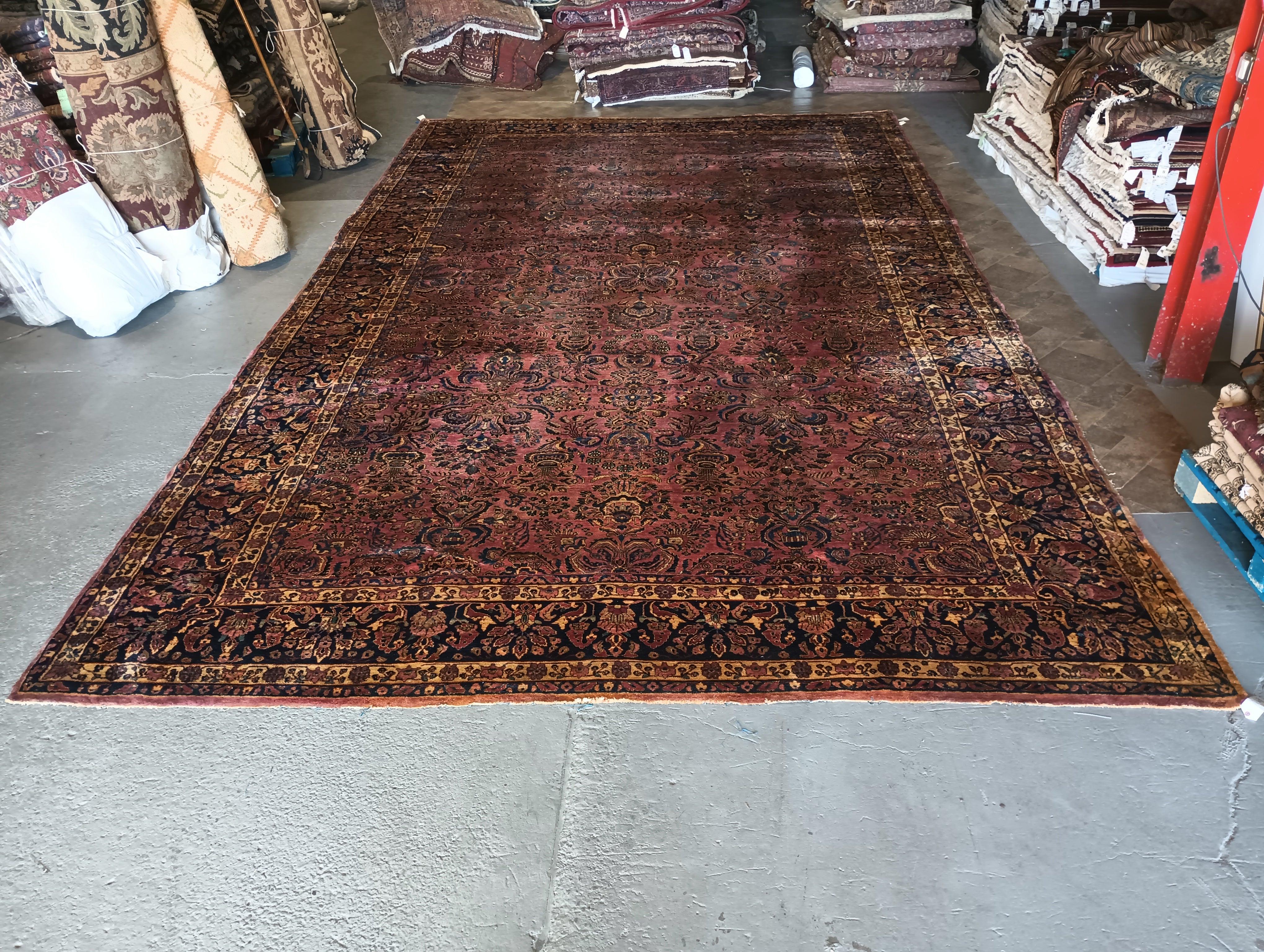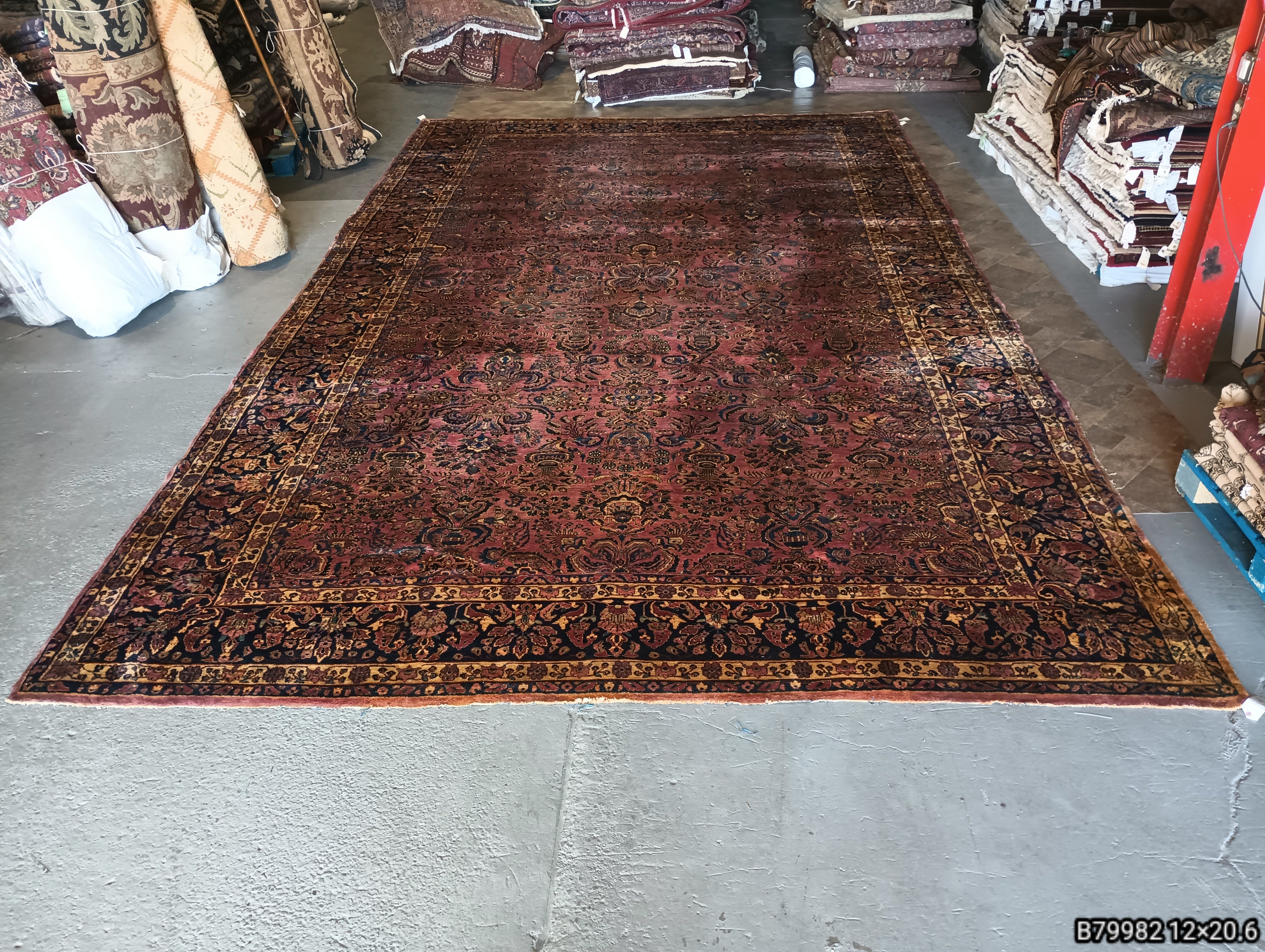 Step into the timeless elegance of our 12' x 20' Antique Quality Persian Sarouk Rug, affectionately known as the "Grandma Carpet". Handcrafted in the renowned weaving centers of Sarouk, Iran, this rug embodies the epitome of tradition and sophistication. Its rich history is evident in every intricately woven detail, showcasing classic Persian motifs in a stunning array of colors.