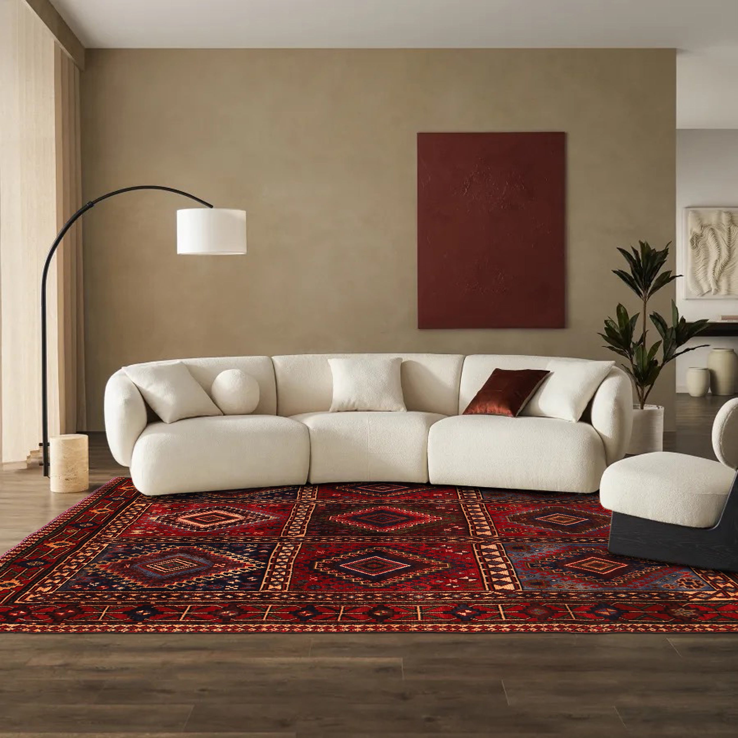 Multicolored- Navy blue background with diamond motifs in shades of crimson, terracotta, and beige, highlighted by accents of sky blue and ivory.