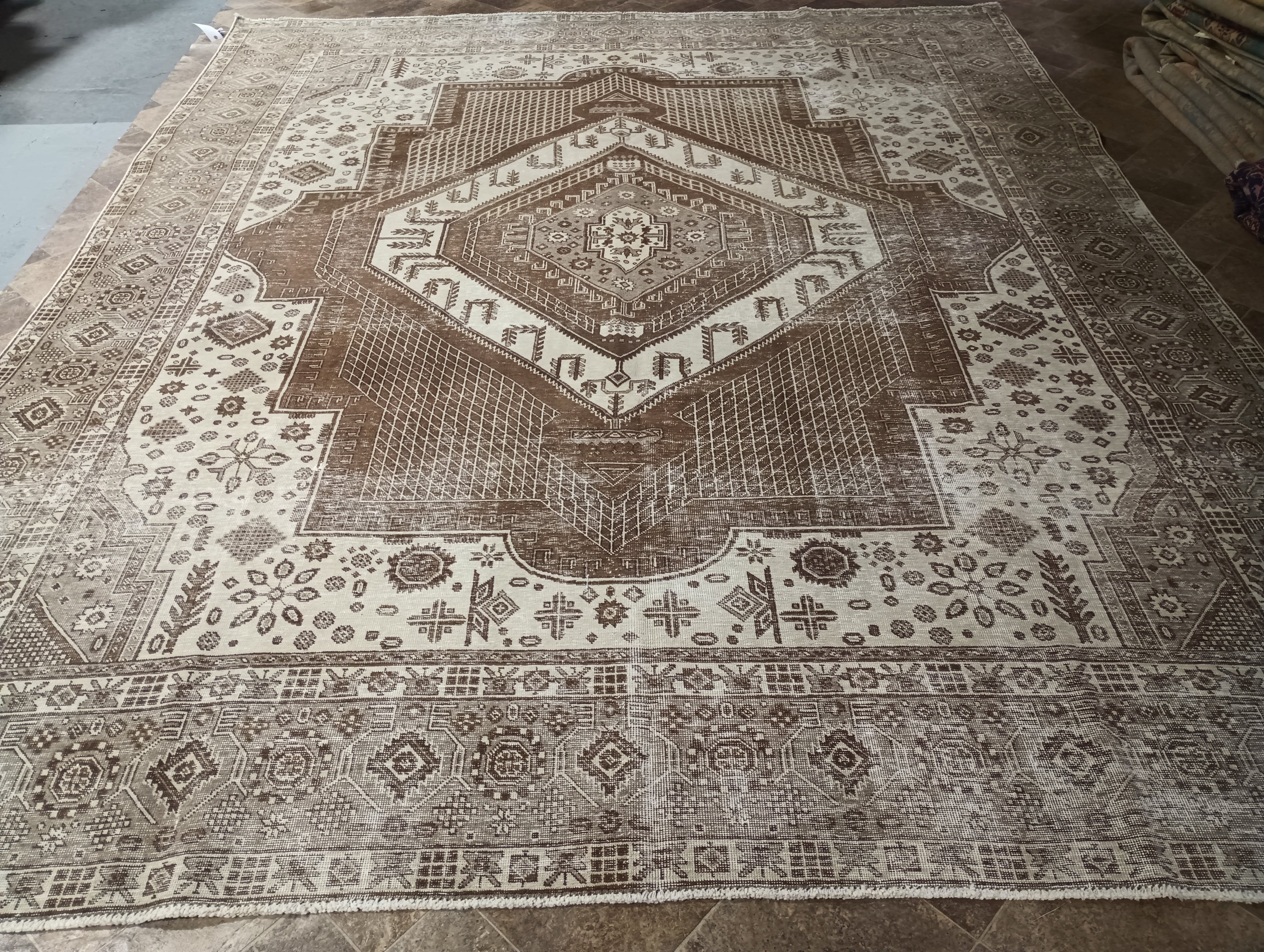 Crafted with utmost precision, this rug features a captivating design with a rich Brown center, intricate Ivory patterns, and a thick mosaic border, adding a touch of sophistication to your space. The geometric pattern brings a sense of balance and harmony to the overall aesthetic.