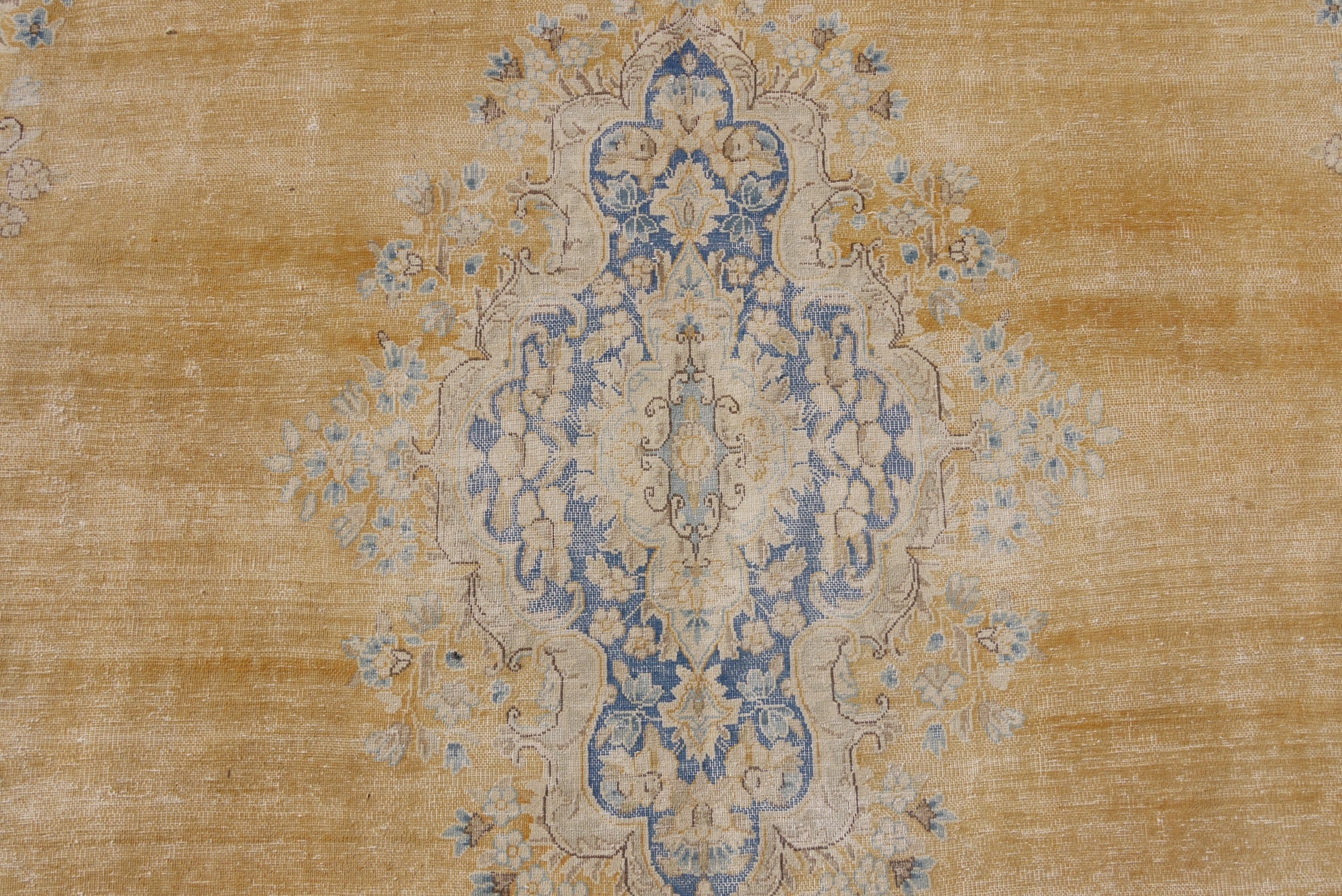 The rug features a captivating color scheme that effortlessly blends sophistication and charm. The center pattern, adorned in shades of blue, draws the eye with its intricate design, while the lustrous gold background provides a luxurious backdrop. The vibrant blue and gray border adds a refined touch, creating a harmonious balance between the center pattern and the surroundings.