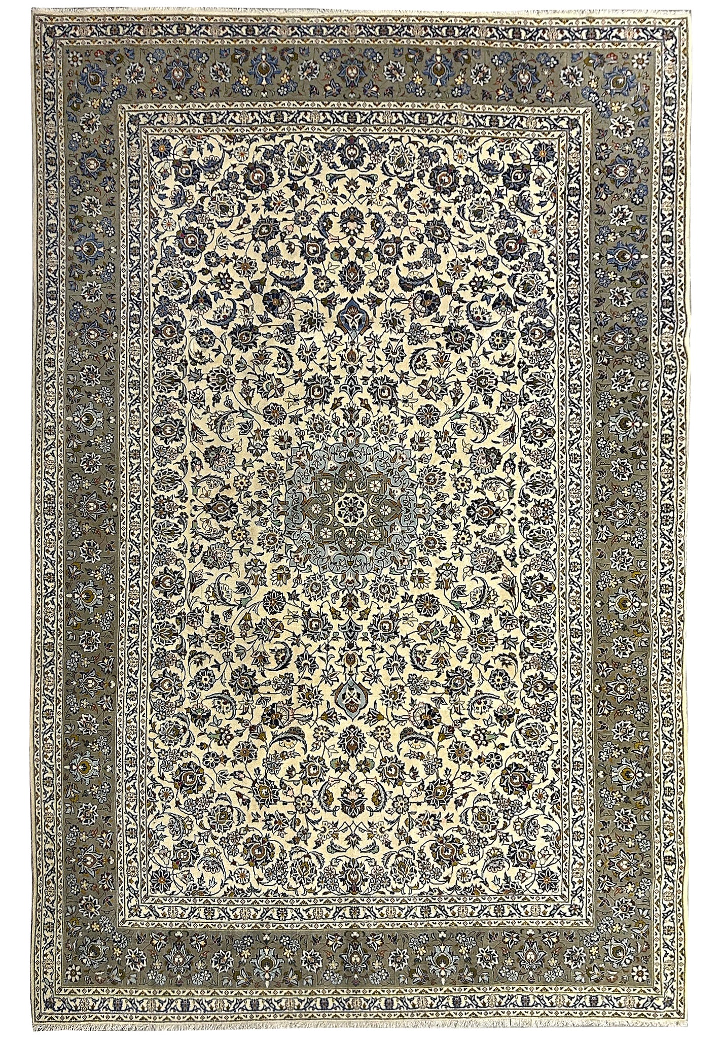 Transform your space with timeless elegance and luxurious comfort with our exquisite 10' x 13' Quality Persian Ivory Olive Blue Kashan Rug. Handcrafted by skilled artisans, this masterpiece boasts intricate designs and rich hues, including soothing ivory, vibrant blue, and earthy olive. Its traditional Kashan pattern adds a touch of opulence to any room, blending seamlessly with both classic and contemporary decor.