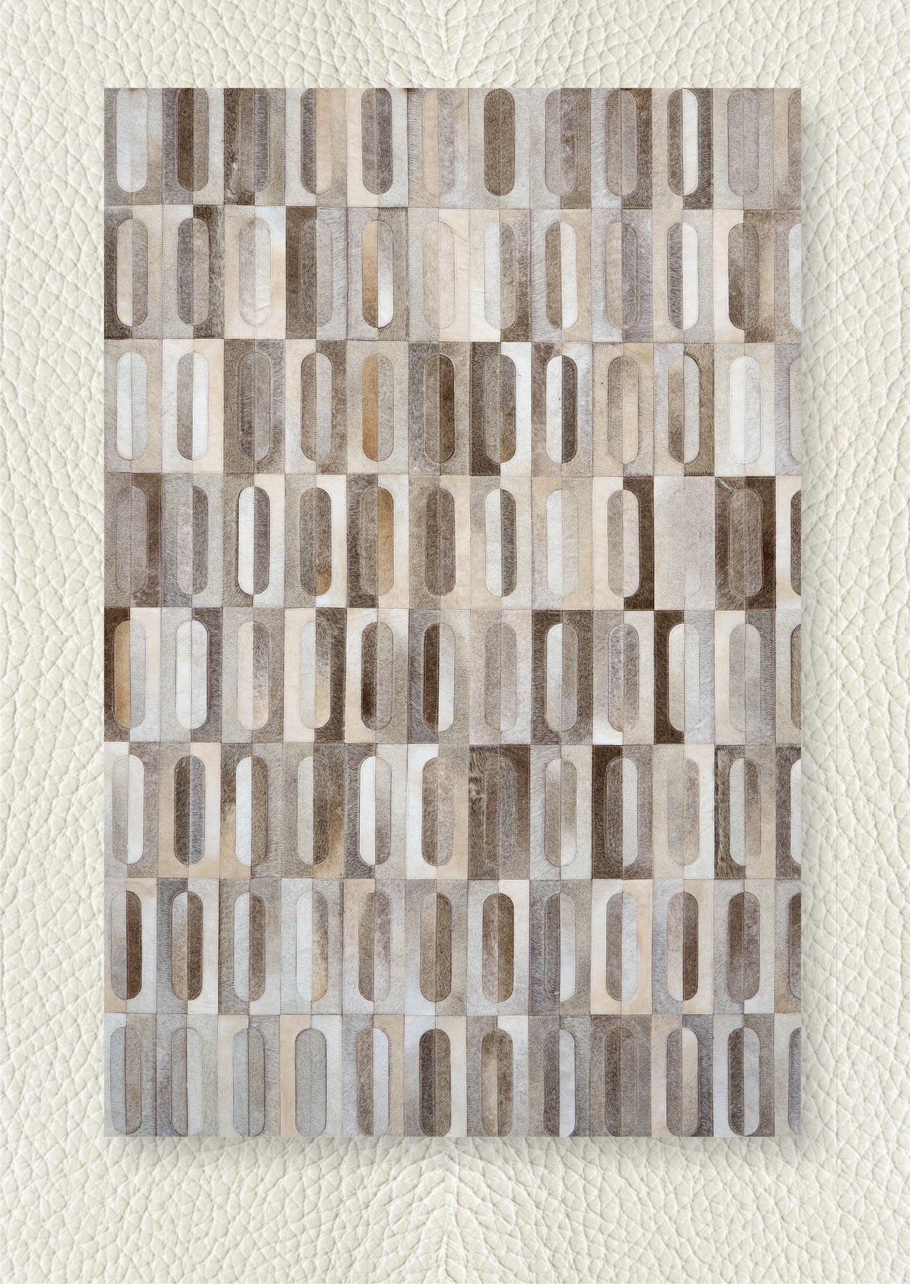 Crafted from premium hair-on cowhide leather, each panel is carefully selected for its natural grain, tonal variation, and durability. Skilled artisans hand-cut and meticulously stitch every capsule-shaped segment to ensure seamless alignment, structural integrity, and long-lasting performance. The hair-on leather surface delivers a soft, tactile feel underfoot while remaining resilient for high-traffic areas such as living rooms, offices, and upscale lounges.