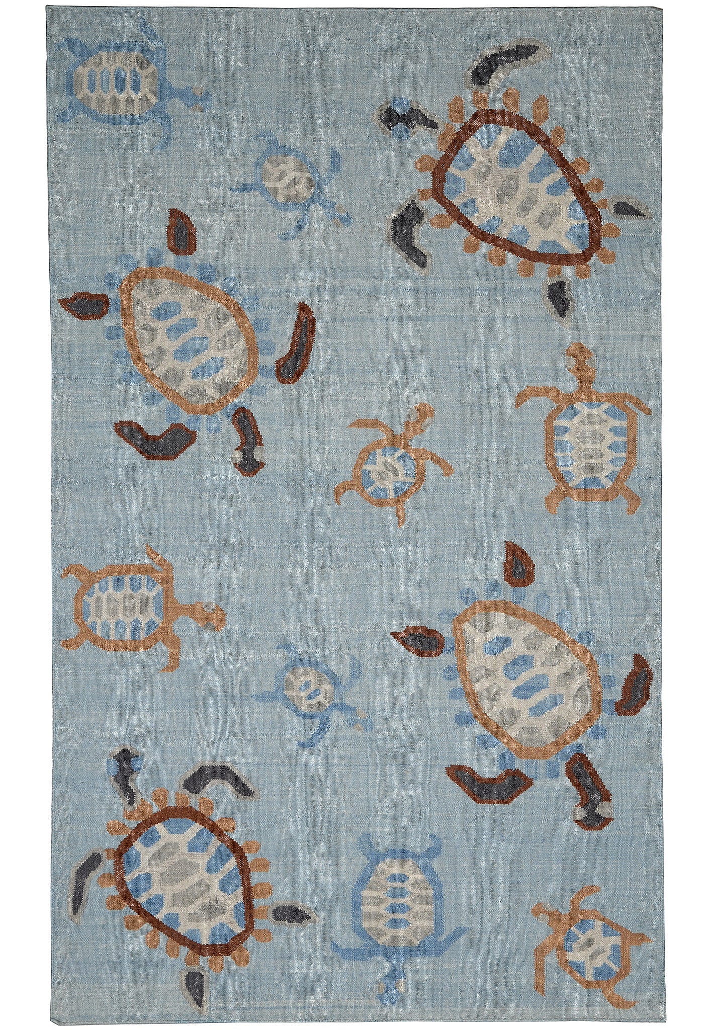 Blue is the main color, with shades of beige, brown, gray, black, and light blue present in the rug.
