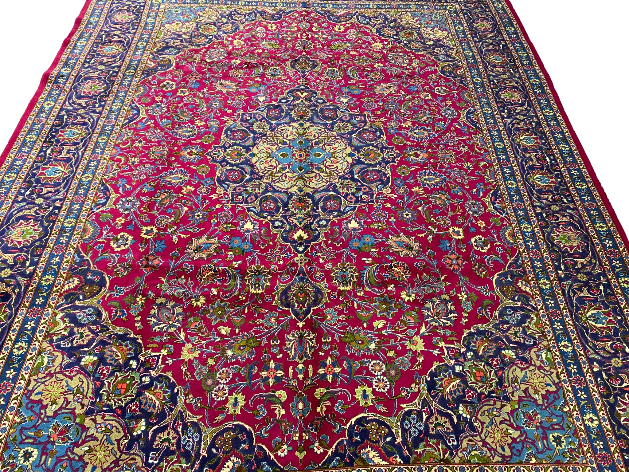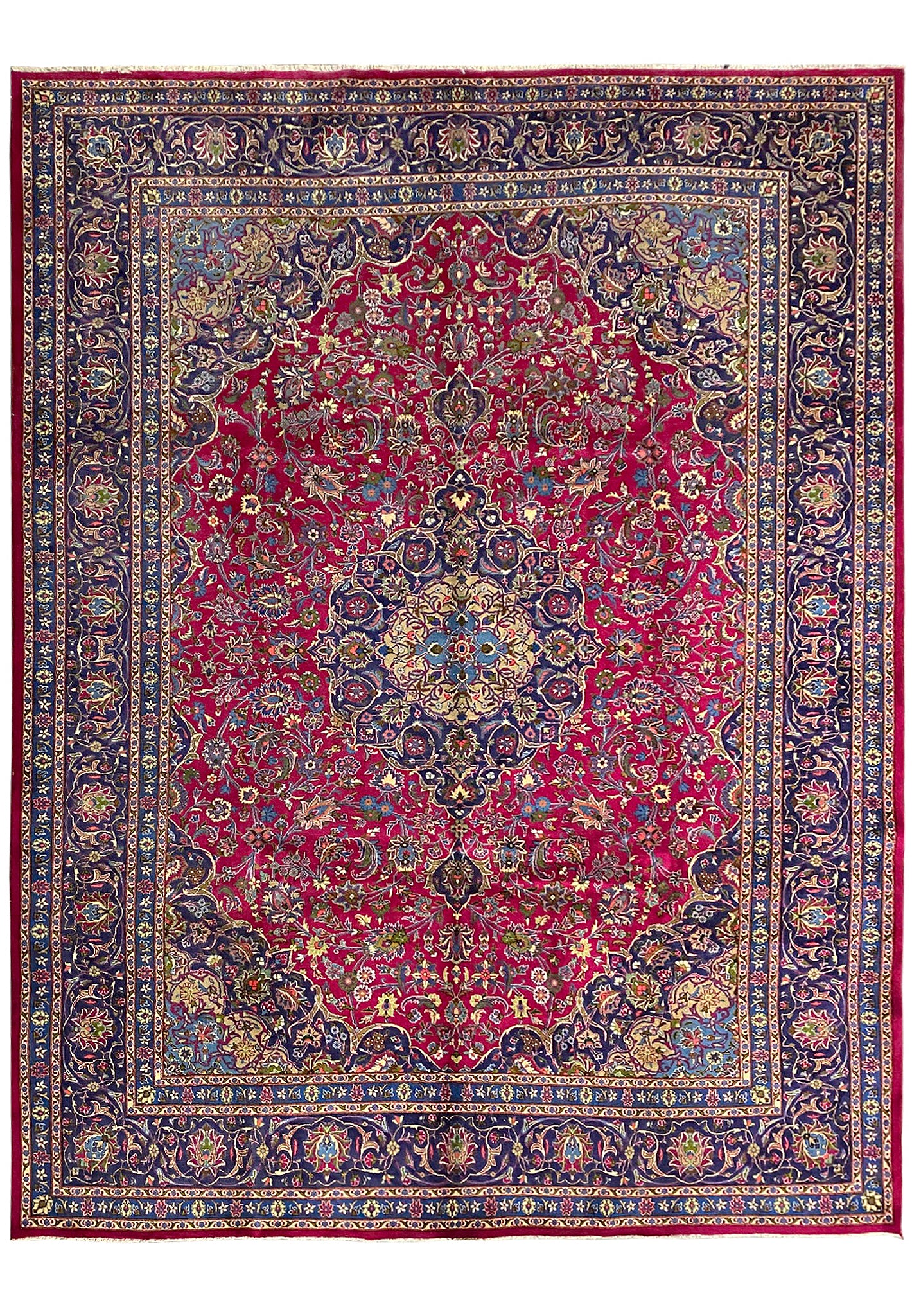 Crafted from premium wool, this rug exudes luxury, durability, and a soft underfoot feel. Measuring 10 by 13 feet, it commands attention as a striking focal point in grand living rooms or elegant dining areas, inviting you to bask in the splendor of Persian craftsmanship and heritage.